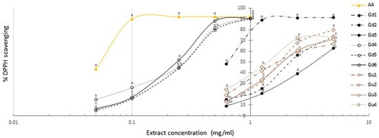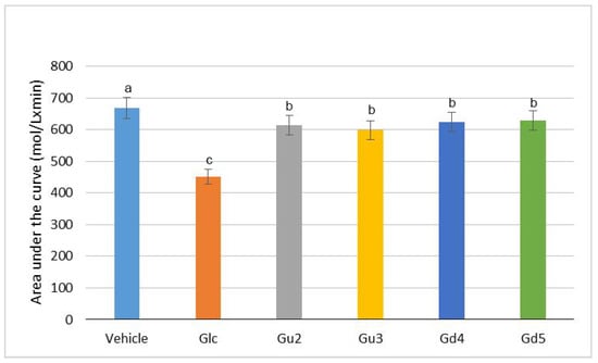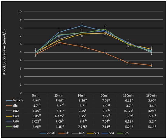 2.4. Antihyperglycemic Activity of the Gd and Gu Extracts on Oral Glucose-Loaded Rats