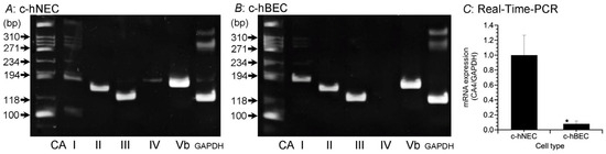 Expression of CA subtypes’ mRNAs. The expressions of CAI, CAII, CAIII, CAIV and CAVb were examined using RT-PCR. (A) c-hNECs. The mRNAs of five CA subtypes were expressed. (B) c-hBECs. The mRNAs of four CA subtypes with the exception of CAIV were expressed. CAIV was expressed in c-hNECs, but not in c-hBECs. (C) The real-time PCR examination of CAIV mRNA in c-hNECs and c-hBECs. The expression level of CAIV mRNA was significantly higher in c-hNEC than in c-hBECs. * significantly different (p < 0.01).