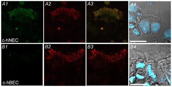 Immunofluorescence examinations for CAIV were carried out in c-hNECs (Figure 3A1–A4) and c-hBECs (Figure 3B1–B4) using AF2186 (anti-CAIV antibody, Figure 3A1,B1) and ab179484 (anti-alpha-tubulin (AC-tubulin) antibody, a cilia marker) (Figure 3A2,B2). The double staining showed that cilia existing in the apical surface are positively stained for CAIV and AC-tubulin in c-hNECs (Figure 3A3). However, in c-hBECs, no immunofluorescence for CAIV was detected in cilia (Figure 3B1–B3). Thus, CAIV exists in the apical cilia of c-hNECs but not in those of c-hBECs.