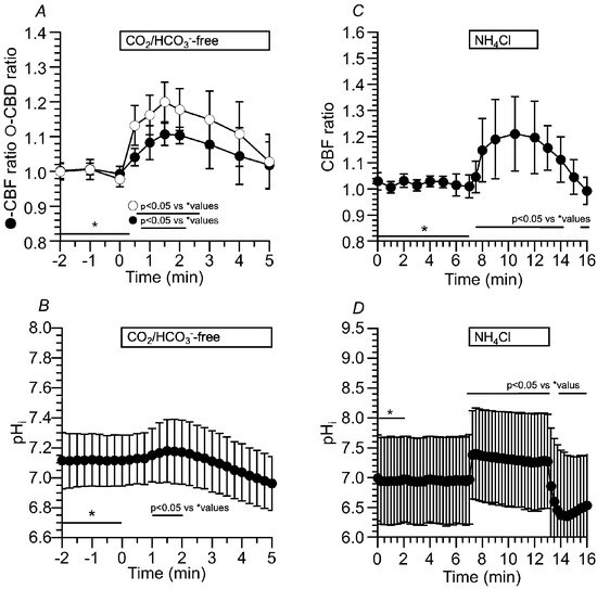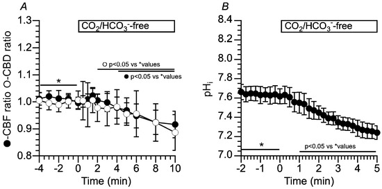 Changes in CBF, CBD and pHi in c-hNECs upon applying Zero-CO2. (A) Changes in CBF and CBD ratios. Application of Zero-CO2 induced a small transient increase followed by a gradual decrease in CBF or CBD. (B) Changes in pHi. Application of Zero-CO2 gradually decreased pHi from 7.65 to 7.30. * shows control values.