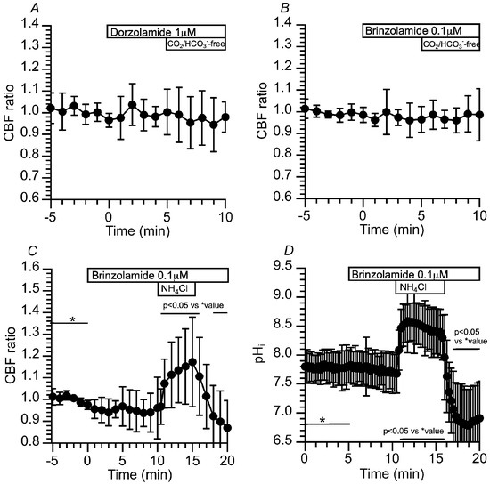 Effects of dorzolamide (an inhibitor of CAII and CAIV) and brinzolamide (a selective inhibitor of CAII) on CBF and pHi in c-hNECs. (A) Effects of dorzolamide (1 µM) on CBF upon applying the Zero-CO2. Dorzolamide abolished the CBF decrease induced by applying the Zero-CO2. (B) Effects of brinzolamide (0.1 µM) on CBF upon applying the Zero-CO2. The addition of brinzolamide abolished the CBF decrease induced by the Zero-CO2. (C) Effects of brinzolamide on CBF changes induced by the NH4+ pulse. In the presence of brinzolamide, the application of the NH4+ pulse induced an immediate increase followed by a gradual increase in CBF. Cessation of the NH4+ pulse immediately decreased CBF. (D) Effects of brinzolamide on pHi changes induced by the NH4+ pulse. Brinzolamide alone did not change the pHi. The subsequent application of the NH4+ pulse induced an immediate increase followed by a slight decrease in pHi. Cessation of the NH4+ pulse immediately decreased pHi, and then pHi increased gradually to a control value. * shows control values.