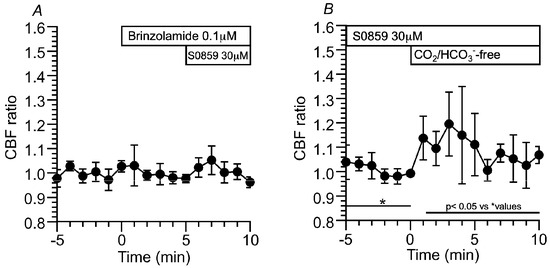 Effects of S0859 on CBF. (A) Prior treatment of brinzolamide. In the presence of brinzolamide, the addition of S0859 did not change CBF in c-hNECs. (B) The c-hNECs were treated with S0859 for 1 h. The application of Zero-CO2 transiently increased CBF in c-hNECs. * shows control values.