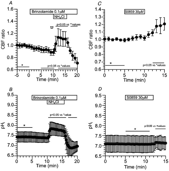 Effects of brinzolamide and S0859 on CBF and pHi in c-hBECs. (A) The addition of brinzolamide gradually decreased CBF, and then application of the NH4+ pulse increased and plateaued CBF. Cessation of the NH4+ pulse decreased CBF. (B) The addition of brinzolamide (0.1 µM) gradually decreased pHi, and then the NH4+ pulse increased and plateaued pHi. Cessation of the NH4+ pulse decreased pHi. (C) The addition of S0859 slightly increased CBF (not significant). Removing S0859 gradually increased CBF. (D) The addition of S0859 did not change pHi. Removing S0859 slightly increased pHi. * shows control values.