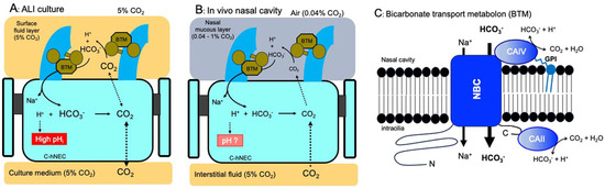 Ciliated-hNECs were cultured in the ALI with 5% CO2 for more than 4 weeks. The culture condition with 5% CO2 is different from the asymmetrical gas condition of c-hNECs and c-hBECs in vivo; the apical surface is exposed to the air (0.04% CO2) periodically, and the basolateral membranes are exposed to interstitial fluid saturated with 5% CO2 (Figure 12). The ALI culture with 5% CO2 enhances the HCO3− transport into c-hNECs. This unphysiological gas condition appears to increase pHi to an extremely high level by maximizing the HCO3− transport via the interactions of CAIV, NBC and CAII (Figure 12A). In c-hBECs expressing no CAIV, CO2 is converted to H+ and HCO3− by CAII. The H+ produced stays in the c-hBECs to decrease pHi, while HCO3− is secreted to the lumen via CFTR and AE [17]. Thus, the ALI culture condition may enhance HCO3− entry, leading to a high pHi in c-hNECs, but it may also enhance the conversion of CO2 to H+, leading to a low pHi in c-hBECs.