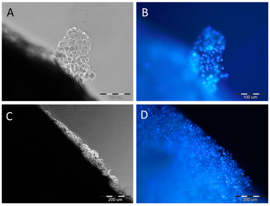 Chondrocytes on the edges of PES scaffolds after six weeks of culture. Samples, before observation, were stained by Hoechst. Scale bars: (A,B)—100 µm; (C,D)—200 µm.