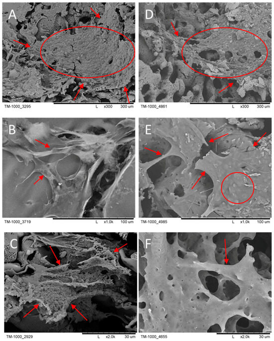 SEM micrographs after six weeks of culture. The red circles and arrows indicate cells with their ECM and newly formed protein. Scale bars: (A,D)—300 µm; (B,E)—100 µm; (C,F)—30 µm.