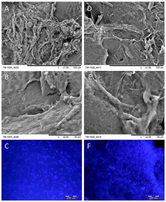SEM micrographs of native cartilage and recoveries (cells with their products) were obtained from scaffolds after 6 weeks of culture. Samples were stained with Hoechst to visualize the nuclei of cells. (A–C)—native cartilage; (D–F)—the recoveries from the PES scaffold. Nuclei staining with Hoechst dye, respectively, for (C)—native cartilage, and (F)—recoveries from PES scaffold. Scale bars: (A,D)—100 µm; (B,E)—30 µm; (C,F)—200 µm.