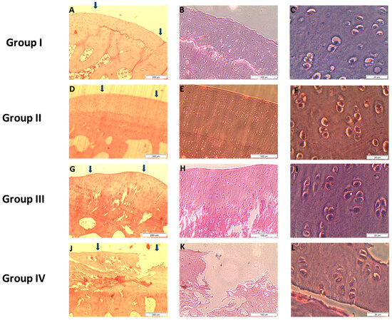 Microscopic images of histological samples of the cartilage of the studied groups (in each row magnification of the photos is increasing from the left to the right side). For group I, II and III, photo (A,D,G), respectively—the defects are bonded at both ends of the graft, group IV is represented by photo (J) (arrows indicate the localization of the lesions in all groups). Photos (A–C): group I after 12 weeks of observation. Photos (D–F): group II after 12 weeks of observation. Photos (G–I): Group III after 12 weeks of observation. Photos (J–L): Group IV after 12 weeks of observation. Scale bars: (A,D,G,J)—200 µm; (B,E,H,K)—100 µm; (C,F,I,L)—20 µm.