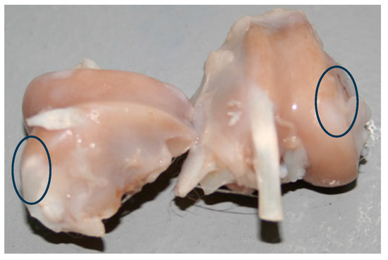 Figure 5 shows complete regeneration (in circles) after 12 weeks for group II. A comparison of the results of the macroscopic and microscopic evaluations of regeneration within the experimental groups was made according to the Brittberg scale [45] and O’Driscoll scores [46,47] (Table 2).