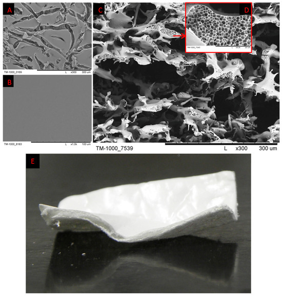 SEM photomicrographs of PES scaffolds: (A)—top layer, (B)—bottom layer, (C)—cross section with macropores, (D)—micropores, (E)—photo of the scaffold. Scale bars: (A,C)—300 µm; (B)—100 µm; (D)—20 µm.
