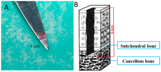 Surgical scissors (A) used to generate an ICRS grade 4 full-thickness defect (B) in the cartilage. Picture B has been modified according to the literature [65].