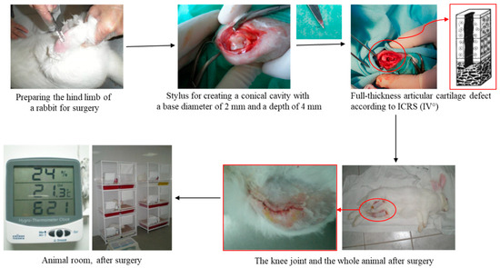 As we did not find any differences in articular cartilage and anatomy in general between the mentioned breeds in the literature, and the inclusion criteria (f.e., age, weight, etc.) were the same for both, White New Zealand and White Popielnianski, we decided to enroll both breeds. All the experimental animals were kept under standard environmental conditions: air humidity 25 ± 10%, temperature 21 °C ± 2 °C, 15 air changes per hour, circadian rhythm (light/dark) 12/12 h. All the procedures were performed by the same surgeon, and all the animals were kept in a dedicated room, in single cages, at the Animal House of the Nencki Institute of Experimental Biology in Warsaw.