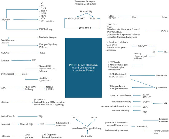 The neuroprotective effects and benefits exerted by molecules related to the activation of estrogen receptors and their signaling mechanisms in the context of Alzheimer’s disease.