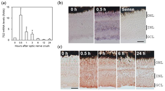 The upregulation of TG2 (transglutaminase 2) in the zebrafish retina after ONLs (optic nerve lesions): (a) TG2 mRNA expression levels were determined using quantitative real-time PCR. Data are expressed as the mean ± SEM, with statistical significance set at * p < 0.05. (b) The in situ hybridization of TG2 in zebrafish retina. TG2 mRNA peaked in the retina 0.5 h after the ONLs; its localization was observed in all nuclear layers in the retina, i.e., the ONLs (outer nuclear layers), the INLs (inner nuclear layers), and the GCLs (ganglion cell layers). (c) The immunohistochemical staining of TG2 in the zebrafish retina. Significant immunostaining was observed at 0.5 h after the ONLs in all nuclear layers, particularly in the GCLs. Scale bar = 20 μm.