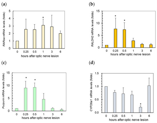 The upregulation of the RA signaling pathway in the zebrafish retina immediately after optic nerve lesions (ONLs): (a) RARαa, (b) RALDH2, and (c) purpurin were upregulated in the retina within 0.25–1 h, while (d) CYP26a1 was downregulated 3 h after the ONLs. The experiments were repeated 6–7 times. Statistical analysis was performed using one-way ANOVA, followed by Scheffe’s multiple-comparison test. Data are expressed as the mean ± SEM, with statistical significance set at * p < 0.05.