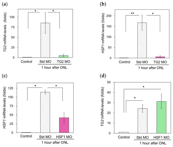 Injection of TG2 MO (morpholino) significantly reduced HSF1 mRNA expression 1 h after ONLs: (a) The TG2 MO-treated samples exhibited significant suppression of TG2 mRNA expression compared with the Std. MO-treated samples. (b) Under these TG2 inhibitory conditions, HSF1 mRNA expression was also inhibited compared with that of the control (Std. MO) samples. (c) The HSF1 MO-treated group exhibited suppression of HSF1 mRNA expression 1 h after the ONLs compared with the Std. MO-treated samples. (d) Even under these HSF1 inhibitory conditions, TG2 mRNA expression was unaffected and increased compared with the control samples rather than tending to be higher than in the Std. MO-treated samples. The experiments were repeated five to six times. Statistical analysis was performed using one-way ANOVA, followed by Scheffe’s multiple-comparison test. Data are expressed as the mean ± SEM, with statistical significance set at * p < 0.05, ** p < 0.01.