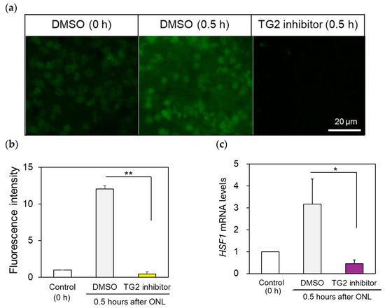 We performed an ocular injection of a TG2-specific inhibitor Z-DON (1 mM) 1 h before the ONLs to confirm the regulation of HSF1 expression via TG2. Under these conditions, the retina was removed 0.5 h after the ONLs, and retinal flat mounts were prepared for reaction with the FITC-labeled TG2-specific substrate. TG2 expression after the ONLs was markedly suppressed at the enzymatic protein level (Figure 4a, TG2 inhibitor, Figure 4b). Compared with the control DMSO dilution injection samples (Figure 4a, DMSO 0.5 h), the TG2 inhibitor-treated samples had almost no enzyme activity; thus, the response of the FITC-labeled TG2-specific substrate could hardly be observed in the flat-mount retina (Figure 4a,b). Under these conditions, HSF1 mRNA expression was also significantly suppressed (Figure 4c).