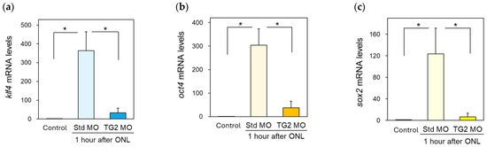 Treatment with TG2 MO (morpholino) significantly downregulated the mRNA expression of Klf4, Oct4, and Sox2 1 h after ONLs. TG2 MO or standard MO (Std. MO) was injected intraocularly 20 h before the ONLs. The TG2 MO-treated samples exhibited suppression of the mRNA expression of klf4 (a), oct4 (b), and sox2 (c) compared with that in the control (Std. MO) samples. Statistical analysis was performed using one-way ANOVA, followed by Scheffe’s multiple-comparison test. Data are expressed as the mean ± SEM of five to six independent experiments, with statistical significance set at * p < 0.05.