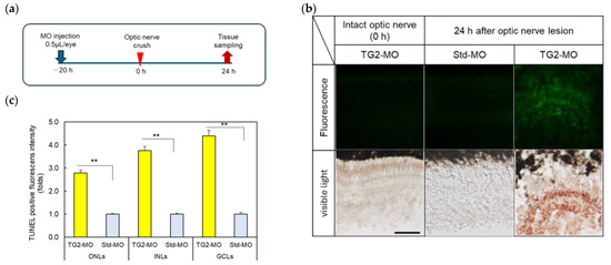 The inhibition of TG2 expression induced neuronal apoptosis in the retina after optic nerve lesions: (a) Timeframe for the administration of TG2-MO (morpholino) or standard MO (Std-MO), the occurrence of optic nerve lesion, and sample collection. (b) The detection of apoptotic cells in the retina 24 h after ONLs through MO administration. Optic nerve crush after the intraocular injection of TG2-specific MO resulted in a marked disruption of the structure of the retinal layer and a significant increase in apoptosis TUNEL-positive cells (FITC fluorescence-positive cells in the upper panel and the red-colored cells in the lower panel). Scale bar = 50 μm. (c) Apoptotic cells were quantified by analyzing fluorescence intensity versus Std-MO control. Data are expressed as the mean ± SEM of five independent experiments and analyzed using one-way ANOVA, followed by Scheffe’s multiple-comparison test. Statistical significance was set at ** p < 0.01. ONLs, outer nuclear layers; INLs, inner nuclear layers; GCLs, ganglion cell layers.