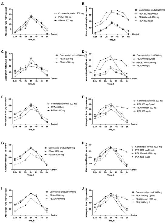 Dose–response (200 mg–1800 mg) and time–course studies of the absorption rate of different forms of PEA. (A,B) Absorption rates of all PEA forms at the concentration of 200 mg; (C,D) absorption rates of all PEA forms at the concentration of 300 mg; (E,F) absorption rates of all PEA forms at the concentration of 600 mg; (G,H) absorption rates of all PEA forms at the concentration of 1200 mg; (I,J) absorption rates of all PEA forms at the concentration of 1800 mg. All absorption analyses were performed after 0.5 h to 6 h of treatment. PEAm = PEA micronised; PEAum = PEA ultra-micronised; PEA 80 mesh = PEA 80 mesh; PEAΩ = PEA 80 mesh dissolved in Ω solvent; PEADynoΩ = PEAΩ = PEA 80 mesh dissolved in Ω solvent included in Dyno. Data are mean ± SD of five independent experiments performed in triplicates vs. control values (0% line, n = 5 independent observation per treatment group and each sample was run in triplicate).