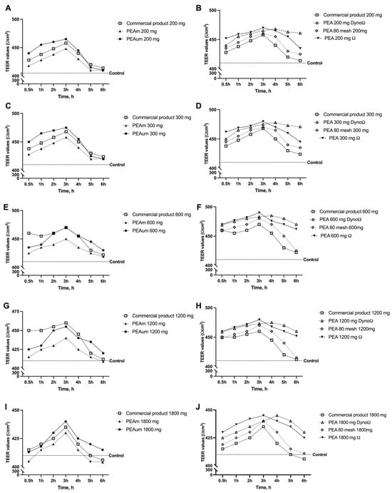 Dose–response (200 mg–1800 mg) and time–course studies of intestinal barrier integrity on Transwell® Corning® Costar®, Merck Life Science, Rome, Italy) by TEER measurements. (A,B) TEER values of all PEA forms at the concentration of 200 mg; (C,D) TEER values of all PEA forms at the concentration of 300 mg; (E,F) TEER values of all PEA forms at the concentration of 600 mg; (G,H) TEER values of all PEA forms at the concentration of 1200 mg; (I,J) TEER values of all PEA forms at the concentration of 1800 mg. All integrity analyses were performed after 0.5 h to 6 h of treatment. The abbreviations are the same as those used in Figure 1. Data are mean ± SD of five independent experiments performed in triplicates vs. control values (0% line, n = 5 independent observation per treatment group and each sample was run in triplicate).