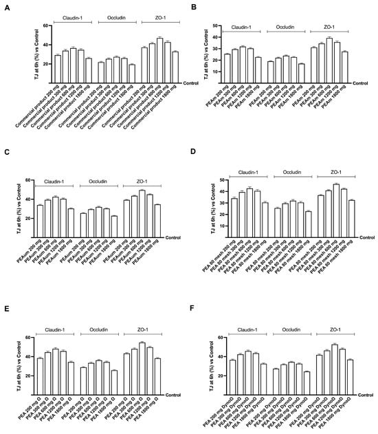 Analysis of intestinal barrier integrity on Transwell® by TJ analysis. (A) TJ analysis of all the commercial product concentrations; (B) TJ analysis of all PEAm concentrations; (C) TJ analysis of all PEAum concentrations; (D) TJ analysis of all PEA 80 mesh concentrations; (E) TJ analysis of all PEAΩ concentrations; (F) TJ analysis of all PEA DynoΩ concentrations. All integrity analyses were performed after 6 h of treatment. The abbreviations are the same as those used in Figure 1. Data are mean ± SD of five independent experiments performed in triplicate vs. control values (0% line, n = 5 independent observation per treatment group and each sample was run in triplicate).