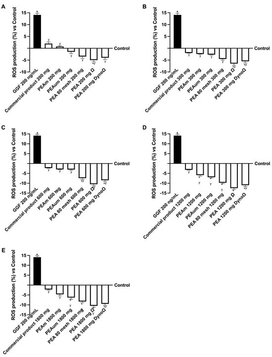 Analysis of the PEA formulation effects under PNI conditions. (A) ROS production after treatment with all PEA forms at the concentration of 200 mg; (B) ROS production after treatment with all PEA forms at the concentration of 300 mg; (C) ROS production after treatment with all PEA forms at the concentration of 600 mg; (D) ROS production after treatment with all PEA forms at the concentration of 1200 mg; (E) ROS production after treatment with all PEA forms at the concentration of 1800 mg. GGF = glial growth factor 2; the other abbreviations are the same as those reported in Figure 1. Data are mean ± SD of five independent experiments performed in triplicates vs. control values (0% line, n = 5 independent observation per treatment group and each sample was run in triplicate). * p < 0.05 vs. control; y p < 0.05 vs. GGF 200 ng/mL.