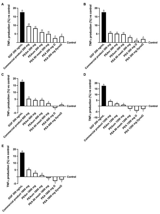 Analysis of the PEA formulation effects under PNI conditions. (A) TNFα production after treatment with all PEA forms at the concentration of 200 mg; (B) TNFα production after treatment with all PEA forms at the concentration of 300 mg; (C) TNFα production after treatment with all PEA forms at the concentration of 600 mg; (D) TNFα production after treatment with all PEA forms at the concentration of 1200 mg; (E) TNFα production after treatment with all PEA forms at the concentration of 1800 mg. The abbreviations are the same as those reported in Figure 4. Data are mean ± SD of five independent experiments performed in triplicates vs. control values (0% line, n = 5 independent observation per treatment group and each sample was run in triplicate). * p < 0.05 vs. control; y p < 0.05 vs. GGF 200 ng/mL.