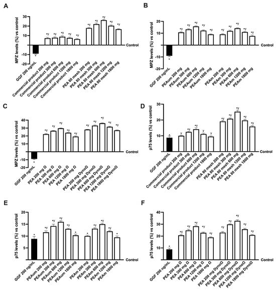 Subsequently, the modulation of neuropathic pain was additionally investigated in an in vitro model. As reported in Figure 6, after nerve injury induced by 200 ng/mL GGF, myelinating cells were subjected to degradation as demonstrated by p75 analysis and, consequently, to the inhibition of myelin protein zero (MPZ) levels (about 8.83% and 9.1%, respectively, p < 0.05). In contrast, it was observed that all varieties and concentrations of PEA demonstrated the capability to mitigate harm, thereby validating their advantageous function in mitigating the process of demyelination (all indicators exhibited statistical significance of p < 0.05 in contrast to the damage). Particularly noteworthy is the superior efficacy of PEAΩ and PEADynoΩ compared to the other PEA formulations examined, as evidenced by their capacity to reverse the damage through the modulation of convoluted markers to uphold the customary operations of the protective sheath. When compared to the commercial product, PEAΩ and PEADynoΩ increased MPZ levels by approximately 7.8-fold and 3.3-fold at the 300 mg dosage, approximately 2.4-fold and 3-fold% at the 600 mg dosage and approximately 2.2-fold and 3.2-fold% at the 1200 mg dosage. Regarding p75 levels compared to the commercial product, PEAΩ and PEADynoΩ increased by approximately 98% and 1.4-fold at the 300 mg dosage, approximately 1-fold and 1.34-fold% at the 600 mg dosage and approximately 1.1-fold and 1.35-fold% at the 1200 mg dosage. In conclusion, 300 mg, 600 mg and 1200 mg were identified as providing the most substantial positive impact. According to data acquired on the MPZ and p75 markers, samples containing 1200 mg had positive effects like those of the relevant ones but at a lower dose of 300 mg, in the 300–1200 mg dosage range. The effectiveness of PEA has been reported to decrease with sample amounts greater than 1200 mg.