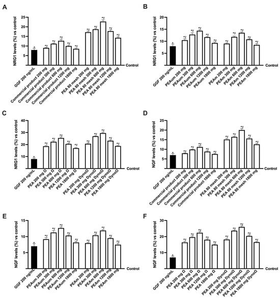 Analysis of the PEA formulation effects under PNI conditions. (A–C) NRG1 levels after treatment with all PEA forms are at the concentration of different PEA forms; (D–F) NGF levels after treatment with all PEA forms are at the concentration of different PEA forms. The abbreviations are the same as those reported in Figure 4. Data are mean ± SD of five independent experiments performed in triplicates vs. control values (0% line, n = 5 independent observation per treatment group and each sample was run in triplicate). * p < 0.05 vs. control; y p < 0.05 vs. GGF 200 ng/mL.