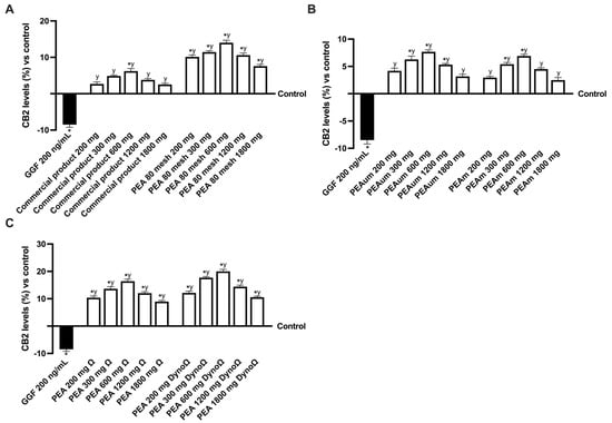 Analysis of CB2 levels after treatment of PEA formulation effects under PNI condition. In (A) CB2 analysis of Commercial product and PEA 80 mesh; in (B) CB2 analysis of PEA um and PEAm; in (C) CB2 analysis of PEA Ω and PEA DynoΩ. The abbreviations are the same as those reported in Figure 4. Data are mean ± SD of five independent experiments performed in triplicates vs. control values (0% line, n = 5 independent observation per treatment group and each sample was run in triplicate). * p < 0.05 vs. control; y p < 0.05 vs. GGF 200 ng/mL.