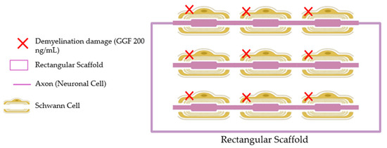 According to the literature, the 3D nerve tissue model was prepared [37]. The interaction between RSC96 and PC12 cell lines is a key feature for mimicking the in vitro peripheral nerve environment, regenerating neurites and supporting Schwann cells [37,79]. Specifically, 1 mL of solution was added to a rectangular scaffold with 16.4 mm × 6.5 mm × 5 mm dimensions. The solution contained 80% v/v Type I rat tail collagen (2 mg/mL in 0.6% acetic acid from Thermo Fischer, Milan, Italy), 10% v/v Minimum Essential Medium (MEM from Merck Life Science, Rome, Italy), 5.8% v/v neutralising solution (from Biosystems, Monza, Italy) and 4.2% Schwann cell suspension (4 × 106 RSC96 cells per 1 mL gel). After the gel had been set, it was placed in 10 mL of DMEM and incubated at 37 °C with 5% CO2 for 24 h to allow for cellular self-alignment. The gel was then stabilised by applying plastic compression (120 g weight for 1 min). Once the gel had been properly aligned and stabilised, it was divided into equal segments based on the samples that needed to be treated. Each segment of the gel was carefully transferred to a 24-well plate. Next, 1 × 105 PC12 cells were placed on the top of each segment to establish the co-cultures. This step is essential as it allows for the extension of neurites across the gel. The 24-well plate containing the gels was then incubated at 37 °C for 1 h, allowing the neuronal cells to attach to the collagen gel. Finally, 1 mL of the culture medium (consisting of DMEM supplemented with 10% FBS, 100 U/mL of Penicillin and 100 μg/mL of Streptomycin purchased from Merck Life Science, Rome, Italy) was added to each well. Before the stimulation, the 3D nerve tissue model was pre-treated with 200 ng/mL GGF after 14 days of maturation until substantial demyelination was achieved.