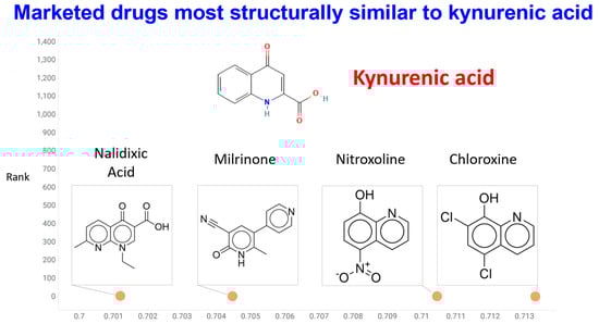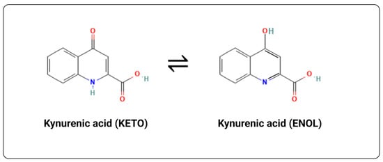 Kynurenic acid (quinurenic acid, 4-oxo-1,4-dihydroquinoline-2-carboxylic acid, or 4-hydroxyquinoline-2-carboxylic acid) (https://pubchem.ncbi.nlm.nih.gov/substance/4854, accessed on 19 August 2024) was first identified in the urine of dogs by Justus von Liebig in 1853 []. It can adopt both keto and enol tautomers, as illustrated in Figure 1.