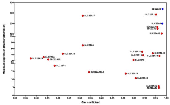 Transcript expression levels and Gini coefficient of SLC22A6 and SLC22A8. Data from [,].