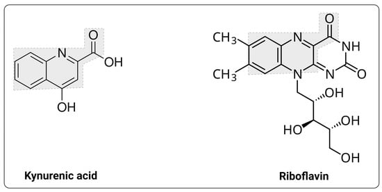 2D chemical structures of kynurenic acid and riboflavin, indicating a common substructure.