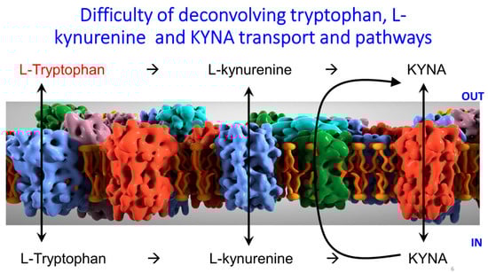 Assessing the fate of KYNA when its precursors are added externally is fraught unless one knows the expression levels of all the relevant transporters, the direction in which they transport, and whether they are concentrative or equilibrative [,], and we only know the existence of some of them. The membrane is redrawn in part from the animation at https://www.youtube.com/watch?v=s23vNwLE-Jw, accessed on 19 August 2024.