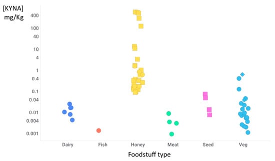 Concentrations in the plasma of the nutraceutical ergothioneine are typically 1–4 μM (~229–916 ng/mL) (e.g., [,]), and are ~10-fold higher in whole blood as ergothioneine is concentrated in erythrocytes []. In contrast, KYNA concentrations in plasma and serum are some 1–2 orders of magnitude lower (Table 2). Moreover, the KYNA plasma concentration is normally far lower than the ~5 μM Km values measured [,] for SLC22A6/8 (and indeed for many of its putative receptors—see [] and below). The median levels are fairly consistently ~30–50 nM in plasma or serum across a very wide range of studies (Table 2). This relative constancy also implies a significant degree of regulation []. With a MW of 189 at pH 7, 50 nM equates to some 9.45 ng KYNA·mL−1 (one paper gives values of KYNA in children that are orders of magnitude different [], and another [] gives very unusually low values; these are not included in Table 2). A recent meta-analysis showing a tendency of serum/plasma KYNA to increase with age is given by [], with similar data in [,], though tissue changes are rather variable [].