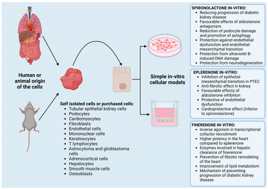 Mineralocorticoid receptor antagonists (MRAs) are one of the renin–angiotensin–aldosterone system inhibitors widely used in clinical practice. While spironolactone and eplerenone have a long-standing profile in clinical medicine, finerenone is a novel agent within the MRA class. It has a higher specificity for mineralocorticoid receptors, eliciting less pronounced adverse effects. Although approved for clinical use in patients with chronic kidney disease and heart failure, intensive non-clinical research aims to further elucidate its mechanism of action, including dose-related selectivity. Within the field, animal models remain the gold standard for non-clinical testing of drug pharmacological and toxicological properties. Their role, however, has been challenged by recent advances in in vitro models, mainly through sophisticated analytical tools and developments in data analysis. Currently, in vitro models are gaining momentum as possible platforms for advanced pharmacological and pathophysiological studies. This article focuses on past, current, and possibly future in vitro cell models research with clinically relevant MRAs.