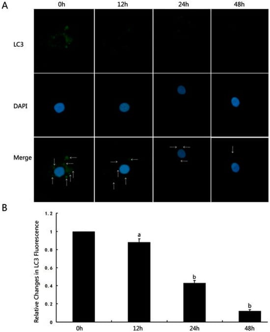 Human conditionally immortalized podocytes were put under mechanical stress. (A) Immunostaining for LC3 puncta and 4′,6-diamidino-2-phenylindole (DAPI)—binding to DNA and presenting nucleus was performed at 0 h, 12 h, 24 h, and 48 h and visualised under confocal microscope (magnification ×1200). LC3 dots are most prominent in the perinuclear and cytoplasmic regions (white arrows in merged images). LC3 puncta staining is lower at 12 h, 24 h, and 48 h, suggesting lower autophagy under mechanical stress. (B) Quantification of LC3 puncta staining showing statistically significant reduction at 24 h and 48 h (b) and statistically non-significant reduction at 12 h (a) [96]. »Reproduced with permission from Li et al., Spironolactone promotes autophagy via inhibiting PI3K/AKT/mTOR signalling pathway and reduce adhesive capacity damage in podocytes under mechanical stress. Published by Bioscience Reports—Portland Press, 2016«. The article is licensed under an open access Creative Commons CC BY 4.0 license [96].