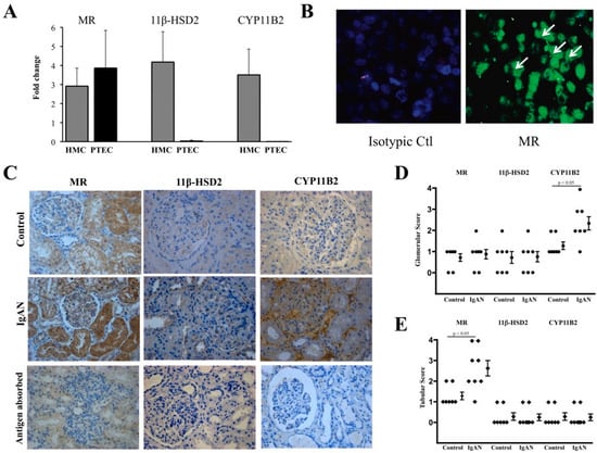 Kidney biopsies of IgA nephropathy patients were obtained, and human mesangial cells (HMC) and human PTEC of IgA nephropathy patients were cultured, and the expression of MRs, 11β hydroxysteroid dehydrogenase (11β-HSD2), and CYP11B2 were determined using qPCR and immunofluorescence. (A) Both cell types expressed MR mRNA, whereas HMC also expressed 11β-HSD2 and CYP11B2. (B) Immunofluorescence of MR expression on PTEC (arrows) under magnification ×200. (C) Detection of all three markers in kidney biopsies of IgA nephropathy patients and controls under magnification ×200—MRs was expressed in glomeruli and tubules, whereas the other two markers were only in glomeruli. (D) A five-point scale was used to show increased glomerular CYP11B2 staining in IgA nephropathy patients compared to controls. (E) A five-point scale was used to show increased tubular MR staining in IgA nephropathy patients compared to controls. [110]. »Reproduced with permission from Leung et al., Oxidative damages in tubular epithelial cells in IgA nephropathy: role of crosstalk between angiotensin II and aldosterone; published by Journal of Translational Medicine—Springer Link, 2011«. The article is licensed under an open access Creative Commons CC BY 4.0 license [110].