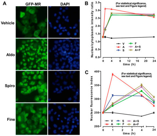 Both tested MRAs can delay MR nuclear translocation. (A) After culturing human kidney GFP-MR cells for 48 h, incubation with aldosterone, spironolactone, and finerenone followed. Anti-GFP antibodies were used for immunocytochemistry with automated ArrayScan VTI fluorescent microscope (left side). DAPI was used for marking the nucleus (right side)—magnification ×20. With aldosterone treatment, complete accumulation of GFP-hMR in the nucleus was seen, but not with finerenone and spironolacotne, where it was partially located in the nucleus (B) Translocation index (average nuclear intensity/average cytoplasmic intensity) was calculated. (C) Average nuclear fluorescence intensity values calculated. V—vehicle; A—aldosterone; S—spironolactone; F—finerenone; Aldo—aldosterone; Spiro—spironolactone; Fine—finerenone [124]. »Reproduced with permission from Amazit et al., Finerenone impedes aldosterone-dependent nuclear import of the mineralocorticoid receptor and prevents genomic recruitment of steroid receptor coactivator-1; published by Journal of Biological Chemistry—currently published by Elsevier; originally published by American Society for Biochemistry and Molecular Biology., 2015«. The article is licensed under an open access Creative Commons CC BY 4.0 license [124].