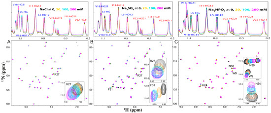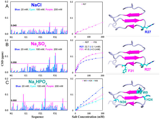 Additional HSQC titrations revealed that NaCl only weakly interacted with some exposed backbone and side-chain amide protons (Figure 2A and Figure 3A). Although at 200 mM, NaCl induced shifts in a set of HSQC peaks, including that of Asn36, only the peak of Arg27 had a significant shift, whose chemical shift difference (CSD) values exceeded the average plus standard deviation (Figure 2A and Figure 3A). On the other hand, the addition of Na2SO4 resulted in relatively large shifts in many amide protons (Figure 2B and Figure 3B). Notably, the HSQC peaks of Arg27 and Phe31 showed significant shifts. Interestingly, the addition of Na2HPO4 also triggered relatively large shifts of many amide protons (Figure 2C and Figure 3C). However, three different residues, Trp9, His24, and Asn36, had HSQC peaks with significant shifts (Figure 3C).