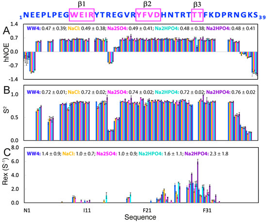 Analysis by Dynamics 3 [33] also indicated that some WW4 residues have additional Rex, which reflects conformational exchanges on the µs-ms time scale. As shown in Figure 4C, without salt, residues with Rex included Trp9, Ile11, Val18, Val22, Asp23, His24, Thr26, Thr28, Thr29, Thr30, and Phe31. In particular, His24, Thr26, Thr28, Thr29, and Thr30 had Rex > 1 Hz. Markedly, the addition of the three salts at different concentrations did not significantly change the overall patterns, but it did alter the Rex values (Figure 4C). For example, the addition of NaCl at 200 mM reduced the average Rex value from 1.4 ± 0.9 (no salt) to 1.0 ± 0.7 (Hz), while the addition of Na2SO4 at 200 mM reduced the average Rex value to 1.0 ± 0.9 (Hz). Very unexpectedly, the addition of Na2HPO4 at 20 mM increased the average Rex value to 1.6 ± 1.1, while the addition of Na2HPO4 at 200 mM dramatically increased the average Rex value to 2.3 ± 1.8.