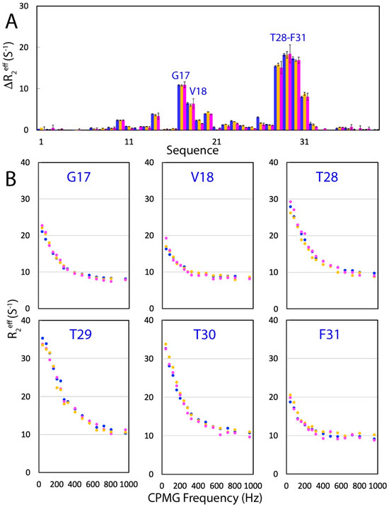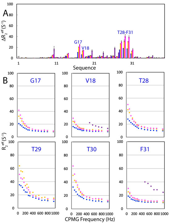 To independently confirm the effects of the three salts on the µs-ms backbone dynamics of WW4, we further performed 15N backbone CPMG relaxation dispersion measurements of WW4 under five conditions at 500 MHz magnetic fields [36,40,41,42,43,44,45,46]. Figure 5A presents ΔR2eff, the differences in effective transverse relaxation rates at 80 and 960 Hz for WW4 in the absence and in the presence of NaCl and Na2SO4 at 200 mM. Briefly, the patterns of ΔR2eff showed no significant differences under the three conditions. The pattern was, in general, consistent with that of Rex derived from “Model-Free” analysis. However, His24 and Thr26 with large Rex values showed no significant CPMG dispersion response. This is commonly observed in a variety of NMR dynamics studies, and many mechanisms might exist to account for the discrepancy between two measurements [36,40,41,42,43]. Furthermore, we analyzed the CPMG dispersion profiles of residues with ΔR2eff > 4 Hz, which included Arg17, Val28, Thr28, Thr29, Thr30, and Phe31 (Figure 5B). In general, the six residues had very similar CPMG dispersion profiles under the three conditions, clearly indicating that the presence of NaCl and Na2SO4 at 200 mM had no significant effects on the µs-ns backbone dynamics of WW4, as measured by CPMG dispersion experiments.