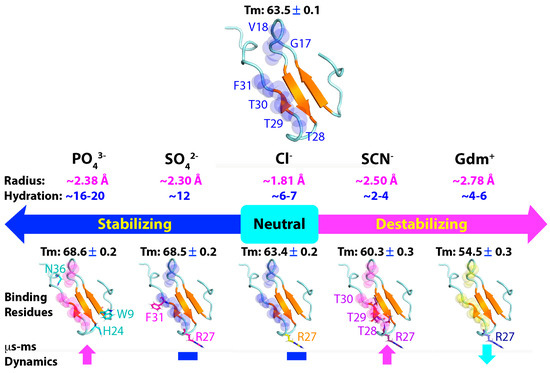 In this context, the effects of the five salts on WW4 can be rationalized, as follows: Because NaCl is inert and had no effect on the stability, while both the Gdm+ cation and Cl− anion only had minor interactions with WW4, the strong destabilizing effect of GdmCl came from the Gdm+ cation, which is capable of strongly disrupting the hydration structure of WW4. This disruption appeared to result in a reduction in the μs-ms backbone dynamics. Similarly, NaSCN appeared to destabilize the stability also via the SCN− anion through breaking the hydration structure of WW4. Additionally, however, the SCN− anion could extensively interact with hydrophobic side chains, thereby disrupting the hydrophobic interactions crucial for protein thermodynamic stability. This disruption is expected to trigger μs-ms backbone dynamics, similar to the increased μs-ms dynamics previously observed by NMR upon the pH-induced disruption of the hydrophobic core of a 37-residue small protein [28,29]. On the other hand, both SO42− and PO43− anions have high charge density and hydration degrees. Consequently, Na2SO4 and Na2HPO4 appeared to significantly enhance the thermal stability of WW4 by stabilizing its hydration structure. Additionally, the two anions could also extensively interact with WW4 residues without interacting with hydrophobic side chains. Due to their different properties, Na2SO4 did not significantly affect the μs-ms backbone dynamics of WW4, whereas Na2HPO4 significantly enhanced these dynamics.