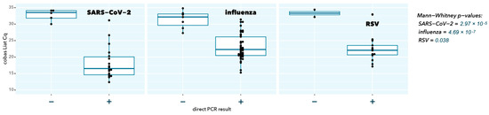 As expected, samples with a negative direct RT-qPCR result had a significantly higher cobas Liat Cq value (low abundance of viral target, p = 2.97 × 10−5, 4.69 × 10−7, and 0.038 for SARS-CoV-2, influenza A, and RSV A, respectively), in line with the higher sensitivity because of a 200-fold higher input in cobas Liat testing compared to direct RT-qPCR (200 µL vs. 1 µL) (Figure 2).