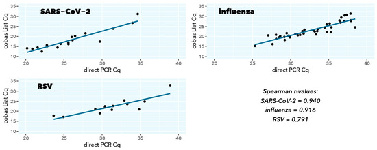 For all viral targets, a good to excellent correlation is observed between the direct RT-qPCR test and the CE-IVDR cobas Liat test Spearman r = 0.940 (p = 1.10 × 10−6), Spearman r = 0.916 (p = 2.20 × 10−16), Spearman r = 0.791 (p = 2.08 × 10−3) for SARS-CoV-2, influenza A, and RSV A, respectively) (Table 3, Figure 3). The mean differences in Cq values between the direct RT-qPCR and cobas Liat were closely in line with the approximately 200-fold difference in input (log2(200) = 7.64), also considering that different primer and probe sequences and PCR reaction conditions were used.