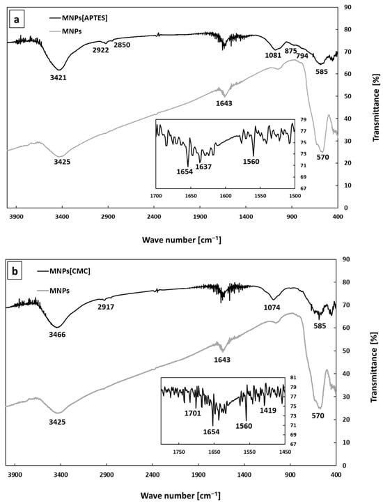 The TEM images (Figure 1) show that the MNPs[APTES] and MNPs[CMC] have a uniform shape and size distribution with a diameter of approximately 10 nm. The effect of the surface functionalization of the bare MNPs and MNPs coated with APTES and CMC, respectively, was confirmed by the FT–IR spectrum in the range of 4000–400 cm−1 (Figure 2a,b). The intensive spectrum band at 570 cm−1 for bare MNPs represents stretching vibrations of Fe–O in the crystalline lattice of Fe3O4. In contrast, the bands at 3425 cm−1 and 1643 cm−1 refer to non-dissociated -OH groups present on the MNPs surface after stabilization with TMAOH. The absorption band at 585 cm−1 for the MNPs[APTES] sample is associated with the metal-oxygen Fe–O bonds (stretching vibrations). The broadband centred at 3421 cm−1 derives from N–H stretching vibrations of APTES. The absorption bands at 2922 cm−1 and 2850 cm−1 correspond to carbon aliphatic chains of C–H (stretching vibrations), whereas these between 1650–1560 derive from N–H deformation vibrations. The band at 1081 cm−1 comes from C–N stretching vibrations and overlaps with Si–O asymmetry stretching vibrations, whereas the bands at 875 and 794 cm−1 correspond to Si–O symmetry stretching vibrations. The absorption band at 585 cm−1 in the MNPs[CMC] sample corresponds to the Fe–O bonds in the crystalline lattice of Fe3O4 (stretching vibrations). The broad band at 3466 cm−1 derives from the stretching vibrations of N–H and O–H bonds, whereas the bands at 2917 and 2850 cm−1 are attributed to the C–H stretching vibration bonds. The spectrum bands at 1654 and 1560 cm−1 present for both MNPs[APTES] and MNPs[CMC] represent deformation vibrations of N–H, and in turn those at 1074 cm−1 are stretching vibrations of C–N. The band at 1419 cm−1 displays symmetrical stretching vibrations of O–H (COOH), whereas the band at 1701 cm−1 is stretching vibrations of C=O (COOH). As observed, the spectra of MNPs[APTES] and MNPs[CMC] are very similar due to having many of the same types of bonds.