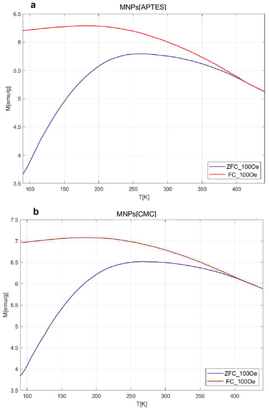 The results obtained for the MvT measurements are shown in Figure 3. For both samples, they indicate a superparamagnetic nature with a blocking temperature (TB) estimated from the point inflections of the dM/dT curve at 103 K for the MNPs[CMC] and 113 K for the MNPs[APTES] nanoparticles. Comparisons of the shapes of the measured loops and field relationships coercivity (HC), magnetization saturation (MS), and magnetic remanence (MR) as a function of temperature are presented in Figure 4. The MS(T) relationship is typical for a ferrimagnetic iron oxide spinel structure. The nature of the HC(T) and MR(T) relationships are akin to each other, which suggests that the dominant source of magnetic hysteresis is the blocking effect of single-domain particles when the energy volume anisotropy is higher than the energy of the thermal excitations.