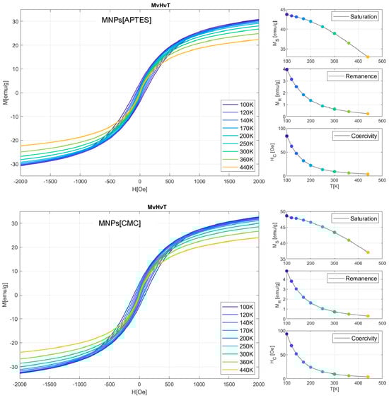 M(H) dependencies for nine selected temperatures in the range from 100 K to 440 K determined on the basis of magnetization saturation, remanence, and coercivity field. The results for the MNPs[APTES] sample are presented in the upper panel and for the MNPs[CMC] sample in the lower panel.